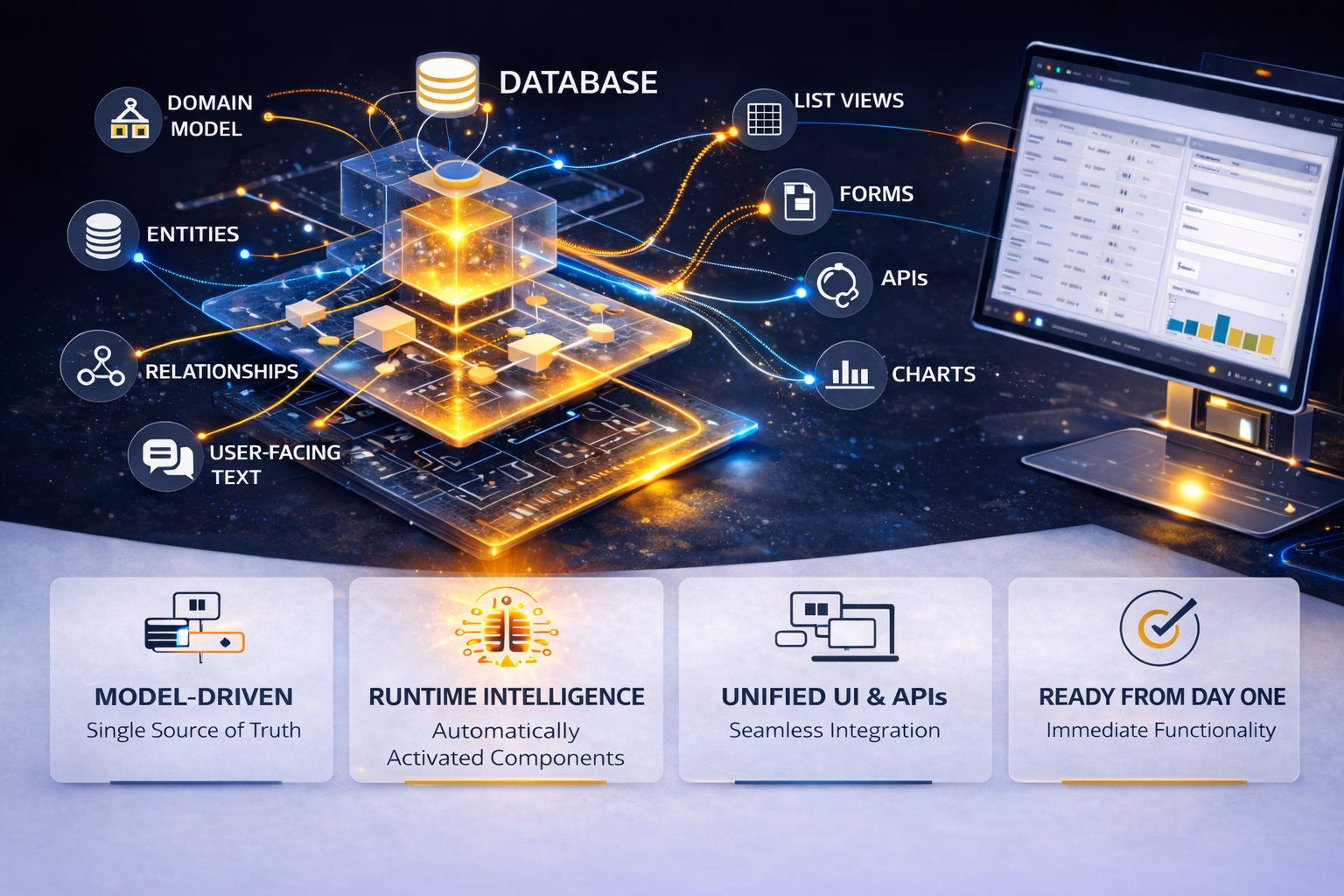 Describe your business domain in plain language, review the generated model, try the app in your browser, and download a structured Visual Studio solution for enterprise-grade .NET development.